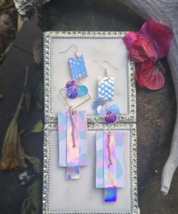 Length 5.5 inches Perfect white glittery and iridescent earrings that you need in your earring collection. Lightweight and easy to wear all day long. Great for summer and winter months. Handmade in San Francisco