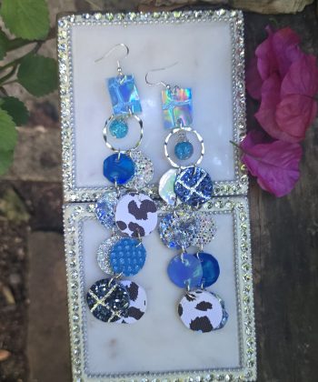 Length 7 inches Be fabulous wearing beautiful blue and silver dangle earrings. Wear with dark blue jeans and a cute top. These statement earrings will get you many compliments. Handmade in San Francisco