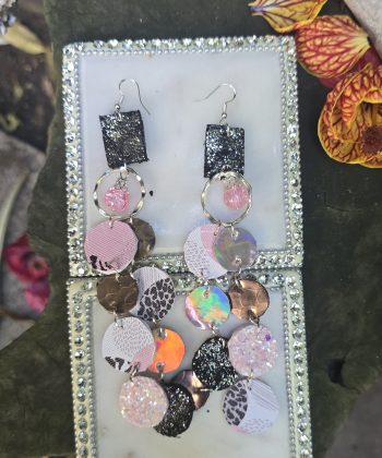 Length 9 inches Sometimes the earrings makes the outfit, and this is a pair that will go with any outfit. Brown neutral with a hint of multiple colors. Wear with jeans and a cute top. Long lightweight statement earrings. Add this pair to your jewelry collection. Handmade in San Francisco