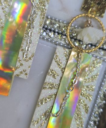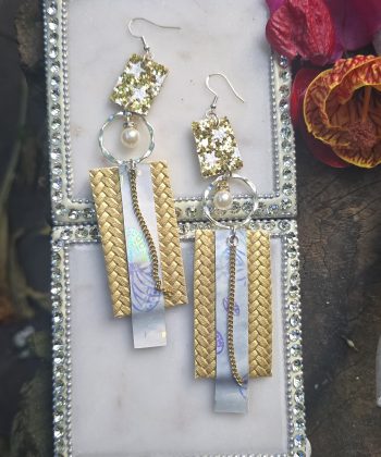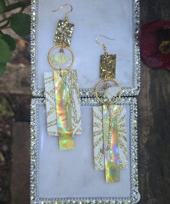 Length 4.5 inches Whether you’re dressing up casual or going full glam, this modern take on dangle earring trend is the perfect addition to your jewelry collection. Beautiful white and gold sparkly earrings. Handmade in San Francisco