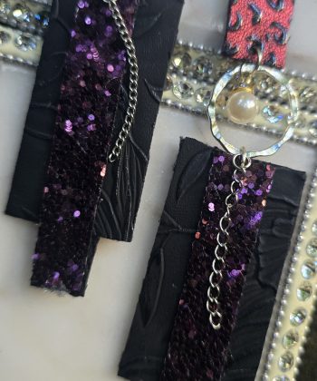 Length 4.5 inches Dress up your black outfit with these sparkly dark earrings with a hint of purple. Wear day to night. Handmade in San Francisco
