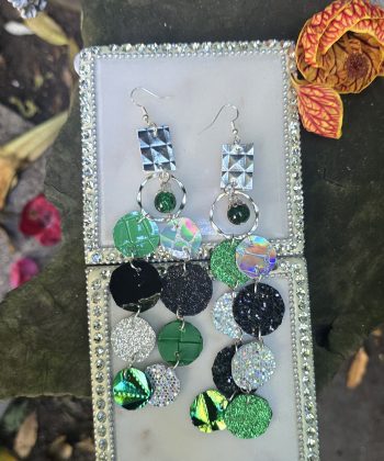 Length 6 inches Be fabulous in these gorgeous green sparkly lightweight statement earrings. Add these beauties to your jewelry collection. Handmade in San Francisco