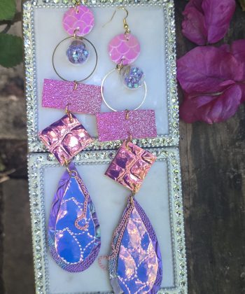 Length 7 inches Pretty in pink long iridescent statement earrings. Wear on a fun day out with your girlfriends. Be prepared to get many compliments. Handmade in San Francisco
