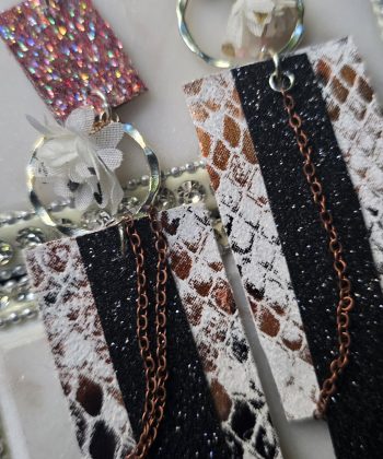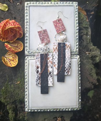 Length 7 inches Lightweight neutral earrings you’ll wear often. Black white with a hint of gold. They will easily wear with many outfits. Handmade in San Francisco