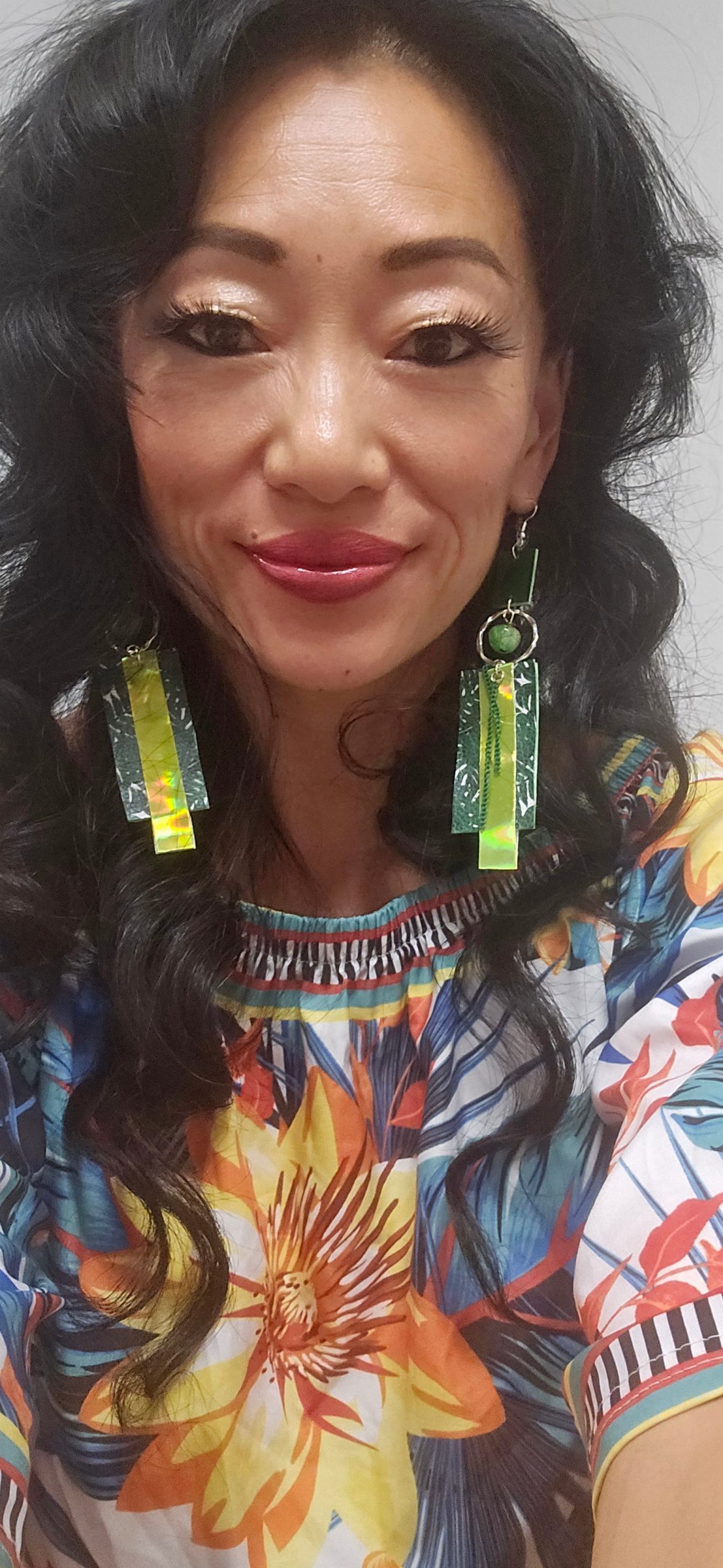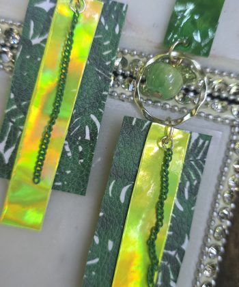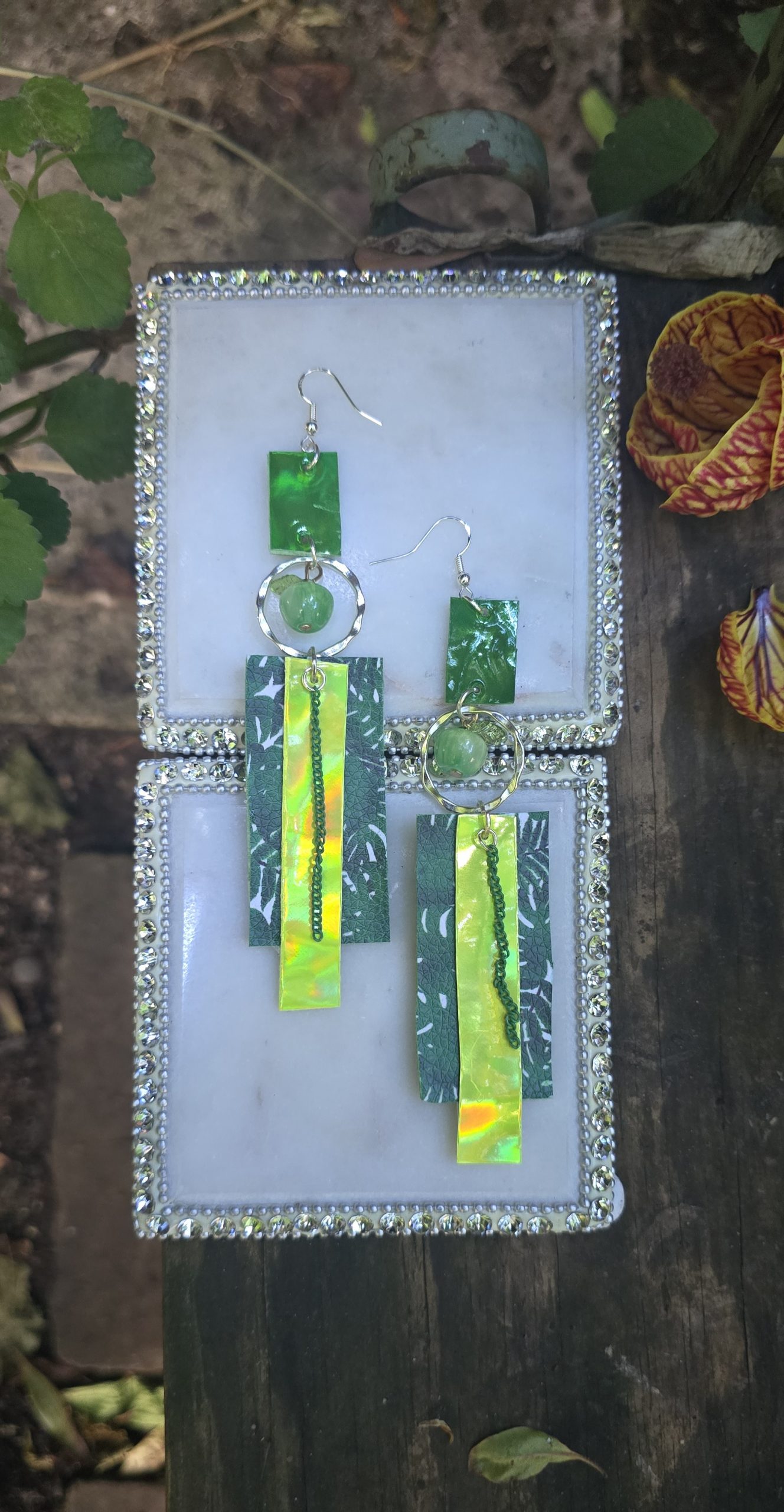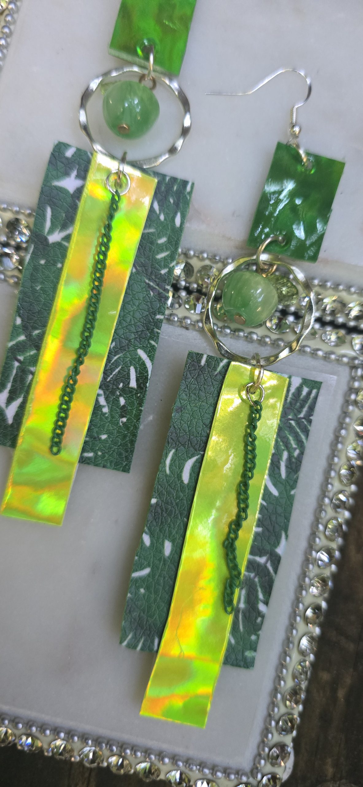 Be fabulous eith these vibrant freen and lime artful earrings. One of a kind, made to turn heads.