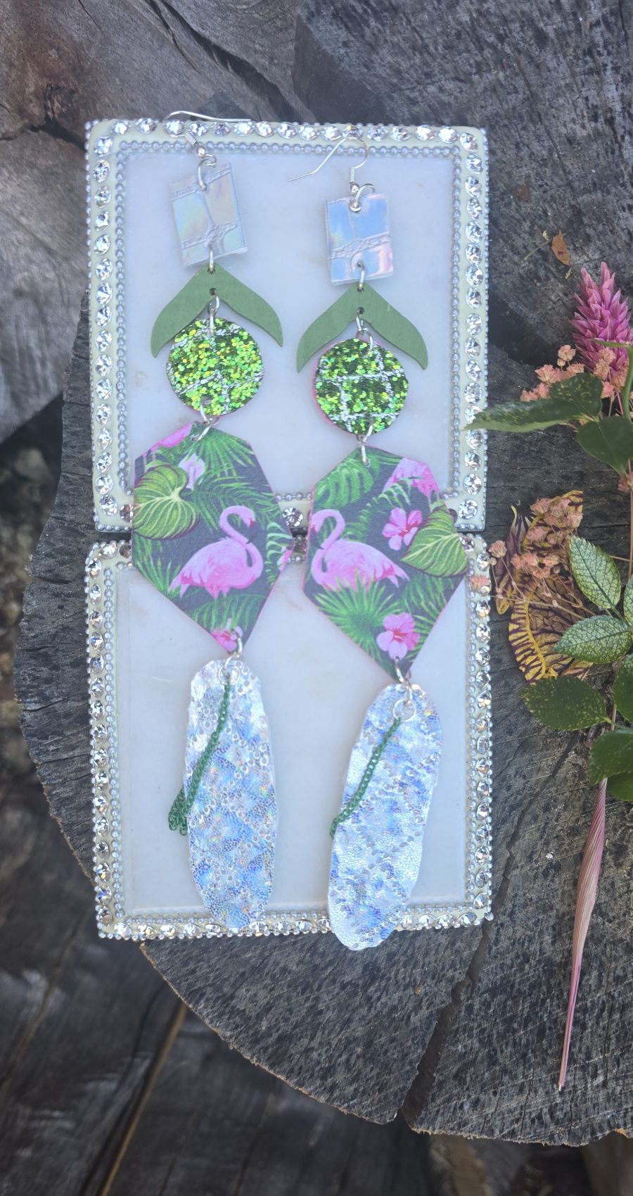 Pink and green summer flamingo fun earrings. Grab your favorite sundress and sandals and get vacation ready. Be fabulous and happy all day long. You’ll get many compliments with these stunners.