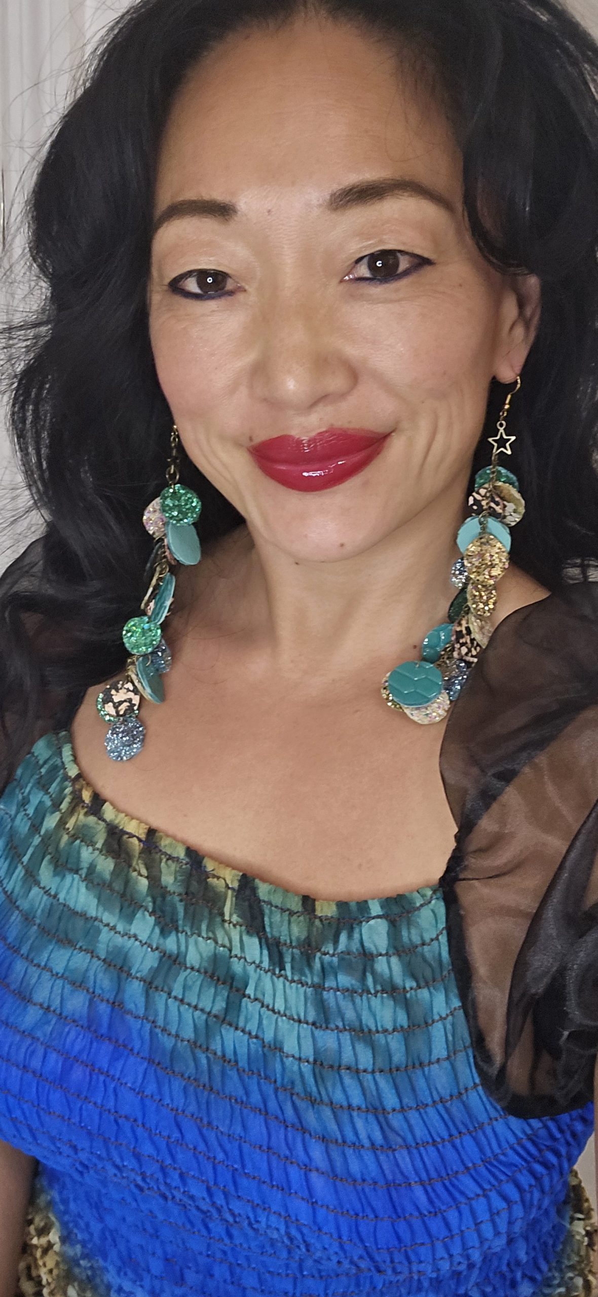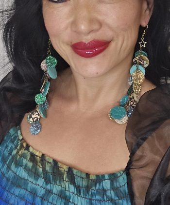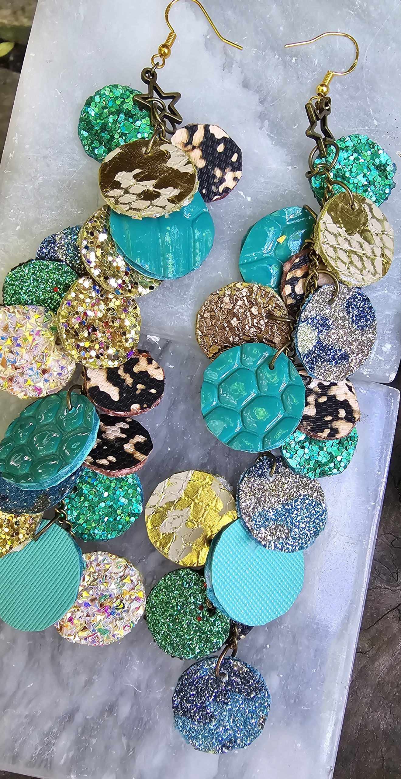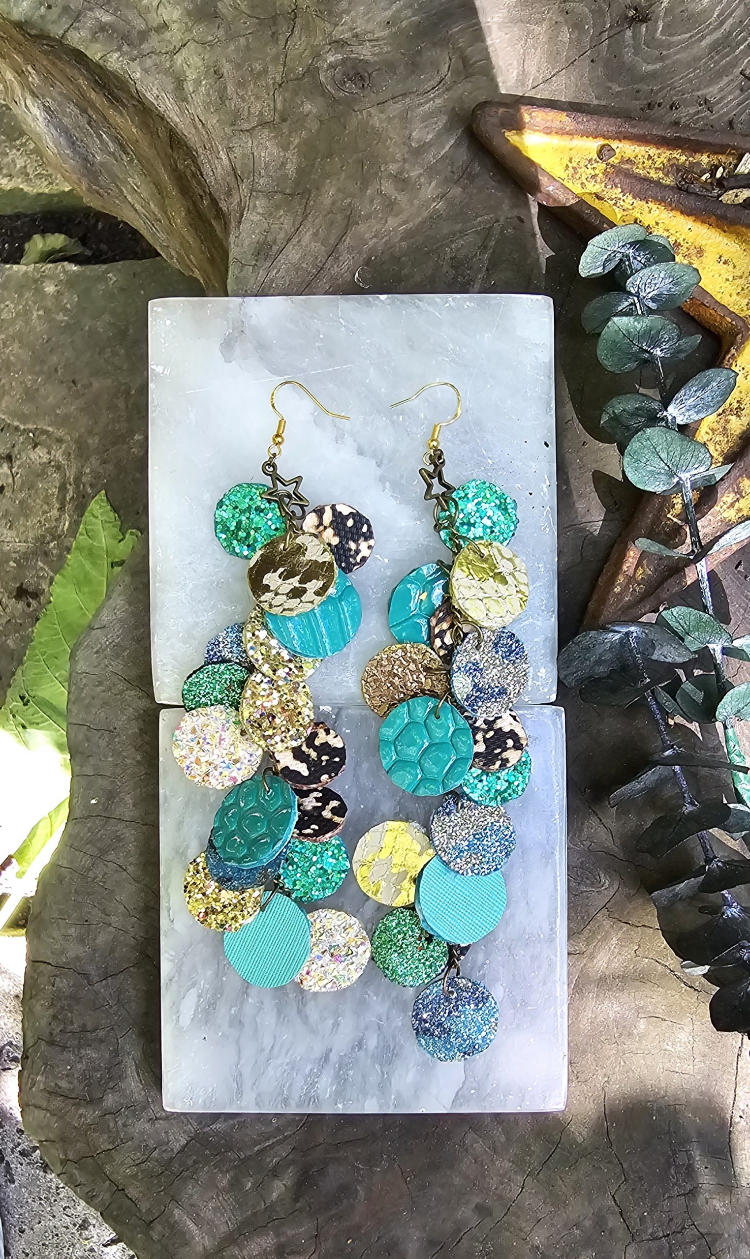Green and turquoise multi colored dangle earrings to add color to your outfit. Lightweight fun earrings to wear all day all night.