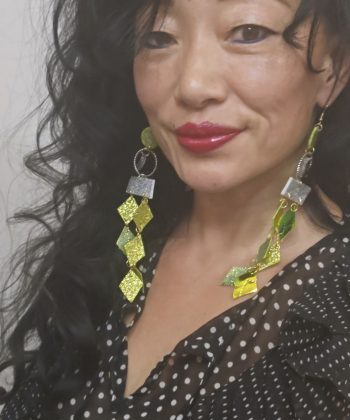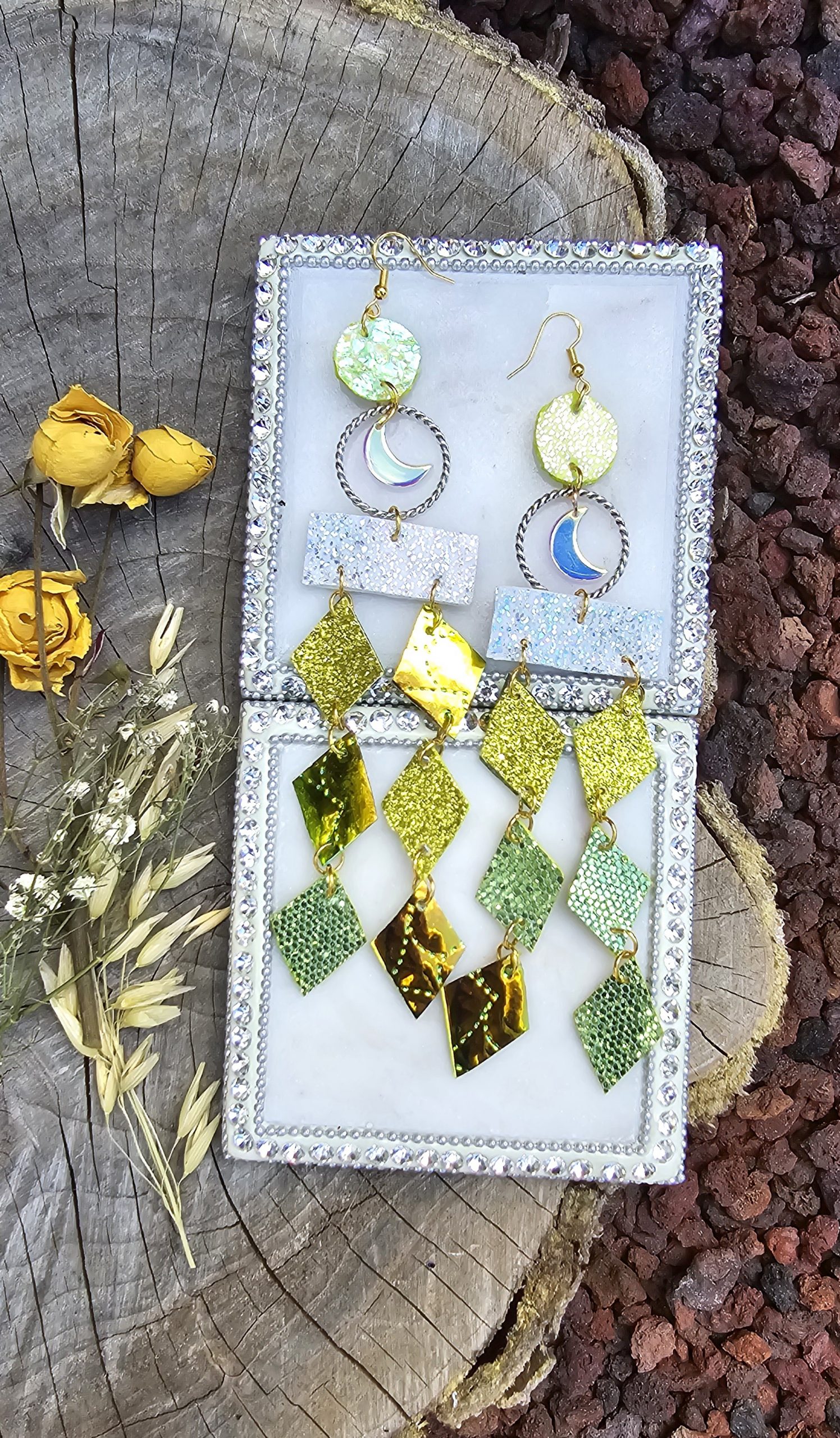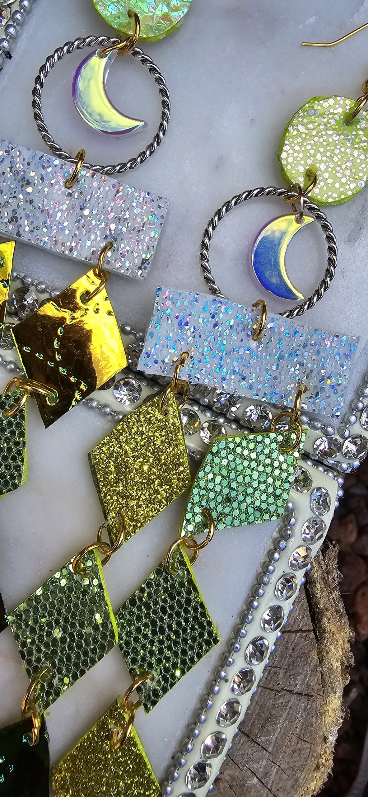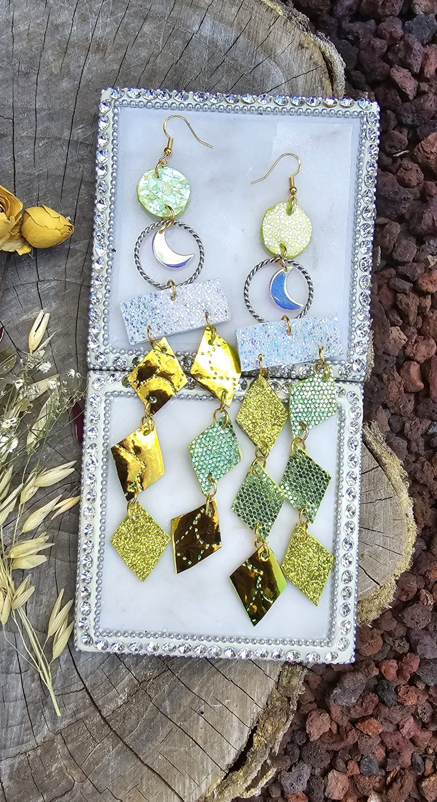 Iridescent green and yellow diamond earrings to brighten your outfit.  I love wearing this lime color.  It’s fun to brighten your outfit with a pop of bright color.