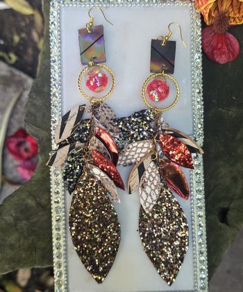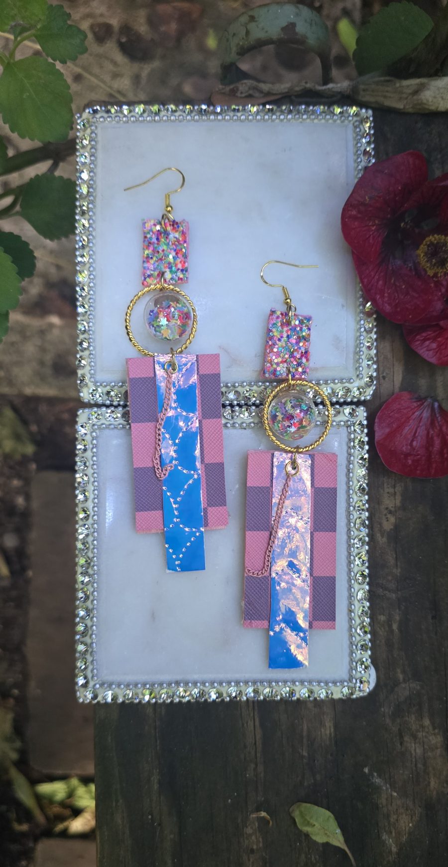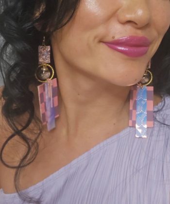 Add a pop of color to your outfit with these fun pink and purple iridescent earrings. Pair with jeand and a cute top.