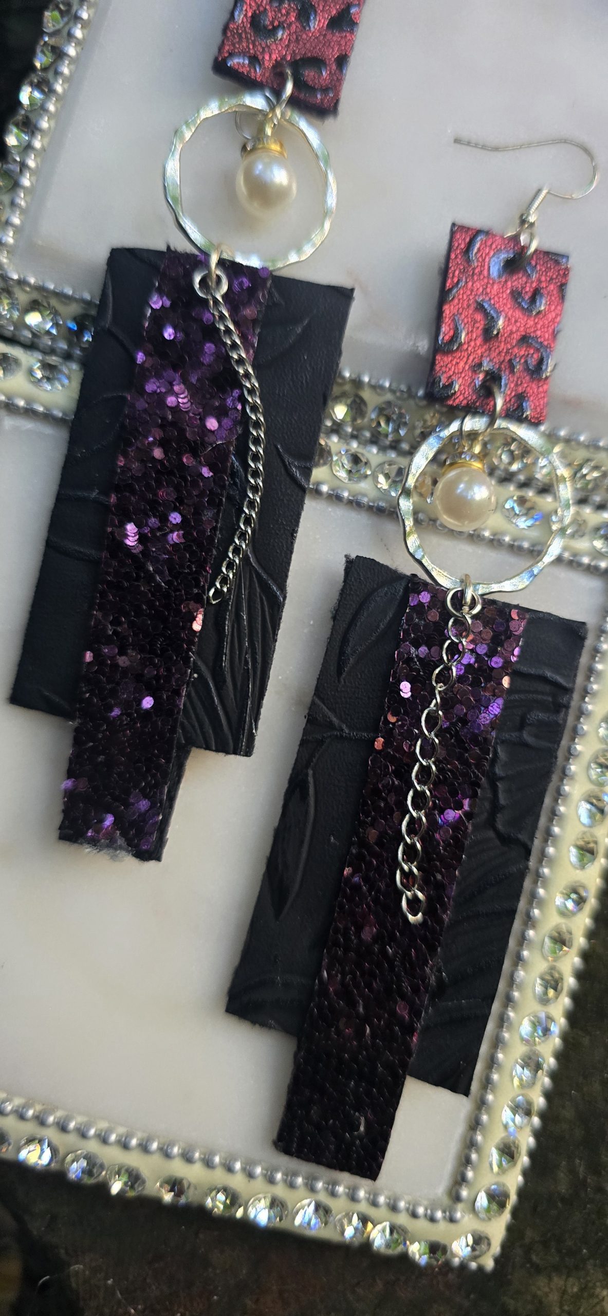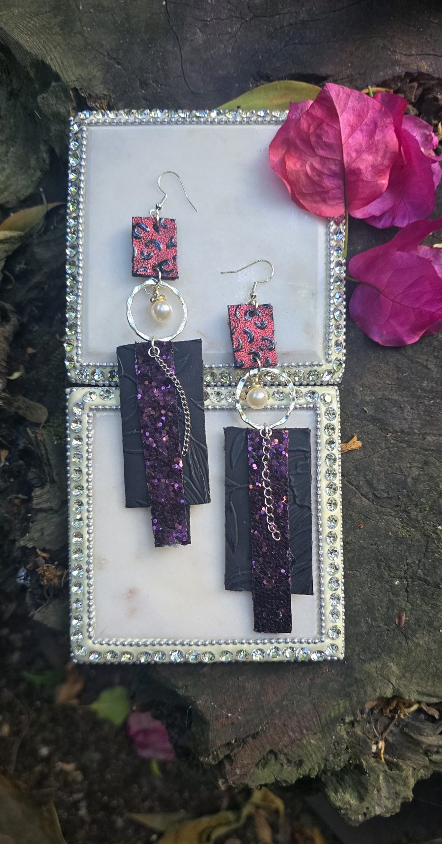 Dress up your black outfit with these sparkly dark earrings with a hint of purple. Wear day to night.